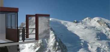 Auf dem nördlichen Gipfel des Aiguille du Midi kommt die Bergbahn an. Eine Brücke verbindet die Bergstation mit dem südlichen Gipfel. Den schönsten Aussichtspunkt erreicht man mit einem Lift, der im Inneren dieses Berges noch einmal 80 Meter überwindet.