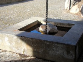 Lange Zeit war das Wallis eine Gefangene der katholischen Kirche. Deren Dogmen ein Stein am Hals der Bevölkerung. Die Spuren der Vergangenheit spiegeln sich im Brunnen vor der Kirche.