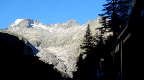 Einst reichte die Zunge des Rhonegletschers bis in die Talebene von Gletsch. Die Klimaerwärmung zwang auch diesen Gletscher zum Rückzug hinter die nächste Felsentreppe. Einst war dieser Blick aus diesem Zug noch atemberaubender.