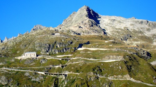 Die Furka-Pass-Strasse führt in Serpentinen hoch zum Pass, der sich auf 2436 Meter über Meer befindet. Links im Bild das Hotel Belvédère. Einst ein Seiler Hotel und heute im Besitz der Familei Carlen. Sie lässt jedes Jahr ein Grotte in den nahen Rhonegletscher schlagen. Wer mit dem Auto, dem Motorrad, dem Velo oder dem Bus unterwegs ist, sollte hier halten.