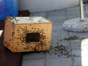 Langsam aber sicher beginnt der Rückzug der Bienen in ihren Stock. Die Königin lebt drei bis fünf Jahren. Die Dronen - sie stechen nicht - ein paar Monate. Und die Arbeitsbienen sterben erschöpft nach gut 3 Wochen. Ungerechte Welt. | | 17.30 Uhr. Alle Bienen sind im Kasten. Das Gewicht des Schwarms schätzt Imker Escher auf 1.2 Kilo. Das sind rund 15'000 Bienen. Sie wandern jetzt mit ihm auf den Simplon. Wir möchten uns herzlich bedanken. Nochmals. |