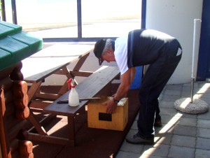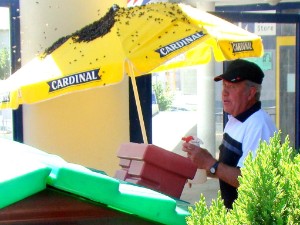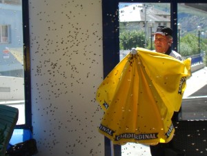 15.30 Uhr. Auf einem Sonnerschirm der Garten Terrasse des Hotels Good Night Inn hat sich ein Bienenschwarm nieder gelassen. Was tun? 118 anrufen. Die Feuerwehr bekämpft nur die Wespen. Für Bienen braucht es einen Imker. | | Der Imker Josef Escher ist eingetroffen. Mit dem Auto aus dem Berisal. Seit 25 Jahren hat er Bienen. Zur Zeit 15 Stöcke. Im Sommer zieht es ihn und seine Bienen auf den Simplon. Hier gibt es den besten Honig. Dank den Alpenrosen. |