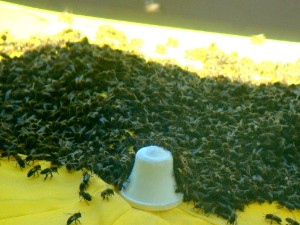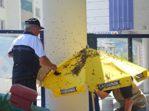 Wer einen Bienenschwarm einfangen will, darf keine Angst haben. Und muss die Königin in seinen Kasten bekommen. Am besten geht das mit einer feinen weichen Bürste. Und der Hilfe des ehemaligen Schweizer Gardisten Escher Adrian. | | Es gibt Bienen und Bienen. Die einen begreifen sofort, dass man der Königin in den Kasten folgen muss. Andere brauchen etwas Zeit. Um den Erkenntnisprozess zu beschleunigen hilft angstfreies Schütteln und Rütteln. Bammel hat der Fotograf. |