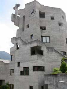 Ein fliegender Beton-Dom in den Alpen. Ein 1971 eingeweihtes modernes Kunstwerk aus Stahl, Zement, Sand und Glas, eingebettet in das Walliser Bergdorf Hérémence.
