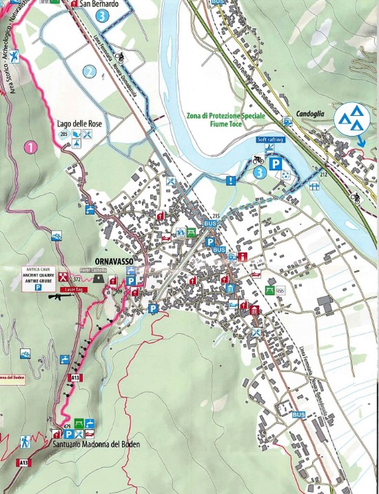 Aui halber Strecke zwischen Ornavasso und dem Santuario Madonna del Boden findet sich der Eingang zu einem Marmor-Steinbruch, den man besichtigen kann. Hier beginnt ebenfalls die Wanderung zu den den im 1. Weltkrieg erbauten Festungsanlagen der Cardona-Linie.