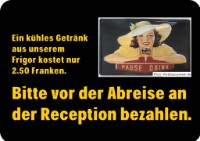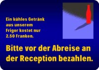 Unsere Lösung: In jedem Stock steht ein frei zugänglicher Kühlschrank mit Getränken. Die Gäste bedienen sich unkompliziert mit Mineralwasser, Bier und Orangensaft. Und bezahlen am nächsten Tag die konsumierten Getränke an der Reception.