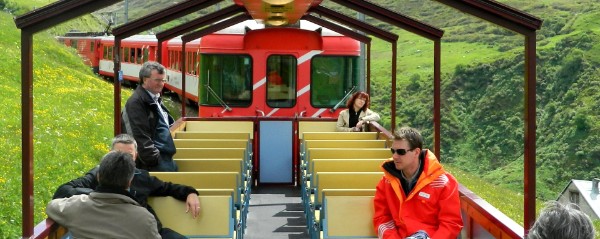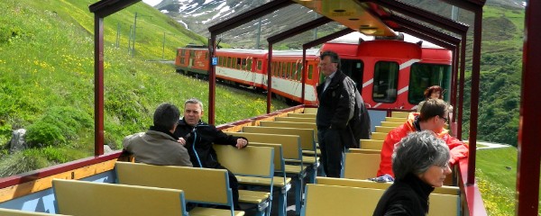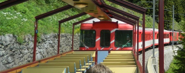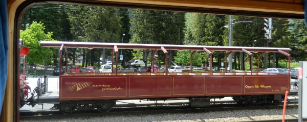 Der offene Open-Air-Wagen bietet 60 Sitzplätze an. Die Fahrt mit ihm durch die Bergwelt zwischen Andermatt und Disentis ist ein einmaliges, da intensives Erlebnis. Offene Strecken wechseln mit kurzen Tunnels.