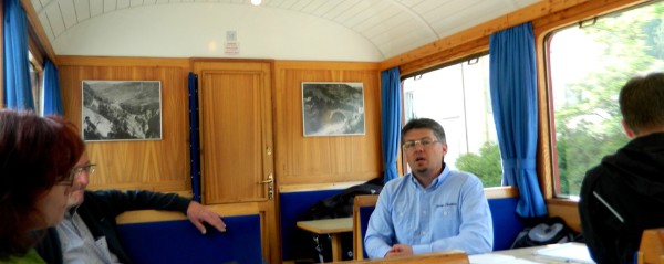Nach dem Oberalp fährt der Zug Richtung Disentis. Neuer Streckenteil und neue Landschaften. Die Testfahrer haben sich in den Belle Epoque Wagen zurückgezogen.