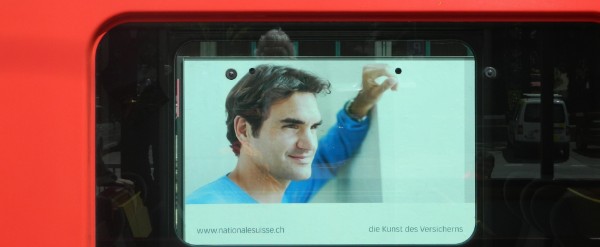Auf den kleinen Bahnhöfen zwischen Andermatt und Disentis kreuzen sich die Züge. Blick durch das Fenster des entgegenkommenden Zuges auf ein Plakat mit Roger Federer. Für einen Moment will es scheinen, auch er sei auf unserer Strecke unterwegs.