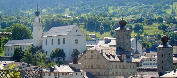 Blick vom Dach des Hotel Good Night Inn auf das Stockalperschloss und das von den Jesuiten gegründete Kollegium Spiritus Sanctus. Die Kirche wurde in den letzten Jahren renoviert. Ein Besuch lohnt sich.